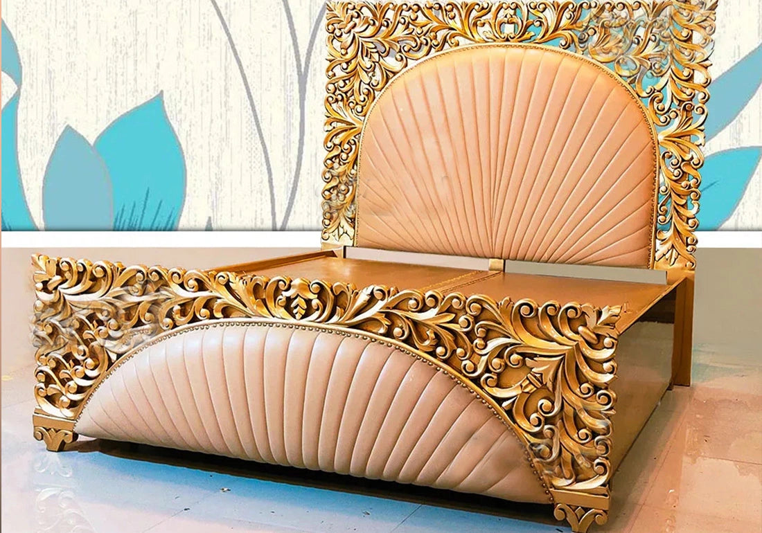 Enjoy the height of sophistication with this Leatherette Royal Bed with Golden Finish, which is skillfully crafted from the finest teak wood. The classic elegance and cutting-edge design of this bed set perfectly melds traditional beauty with contemporary usefulness. The inviting focal point for your bedroom that teak wood's warm, natural tones create is warmth and personality.