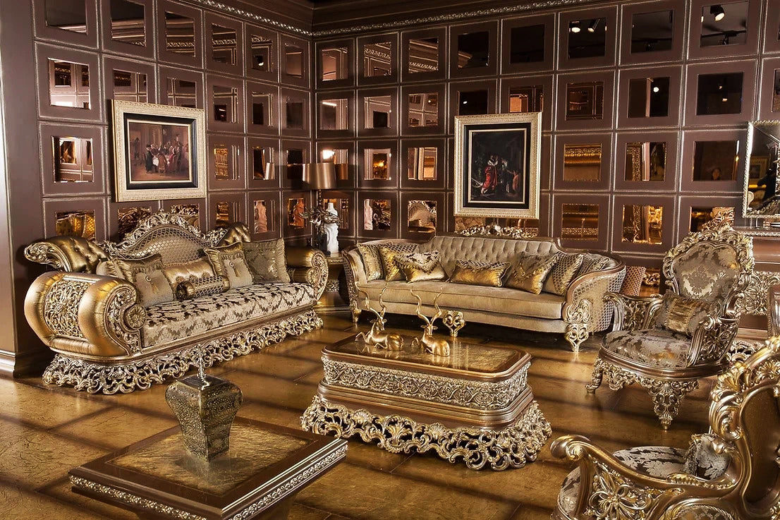 The sumptuous upholstery complements the rich wood tones, enveloping you in a realm of comfort and prestige. The harmonious blend of luxurious fabrics and masterful carving craftsmanship creates an ambiance that speaks of both splendor and coziness.