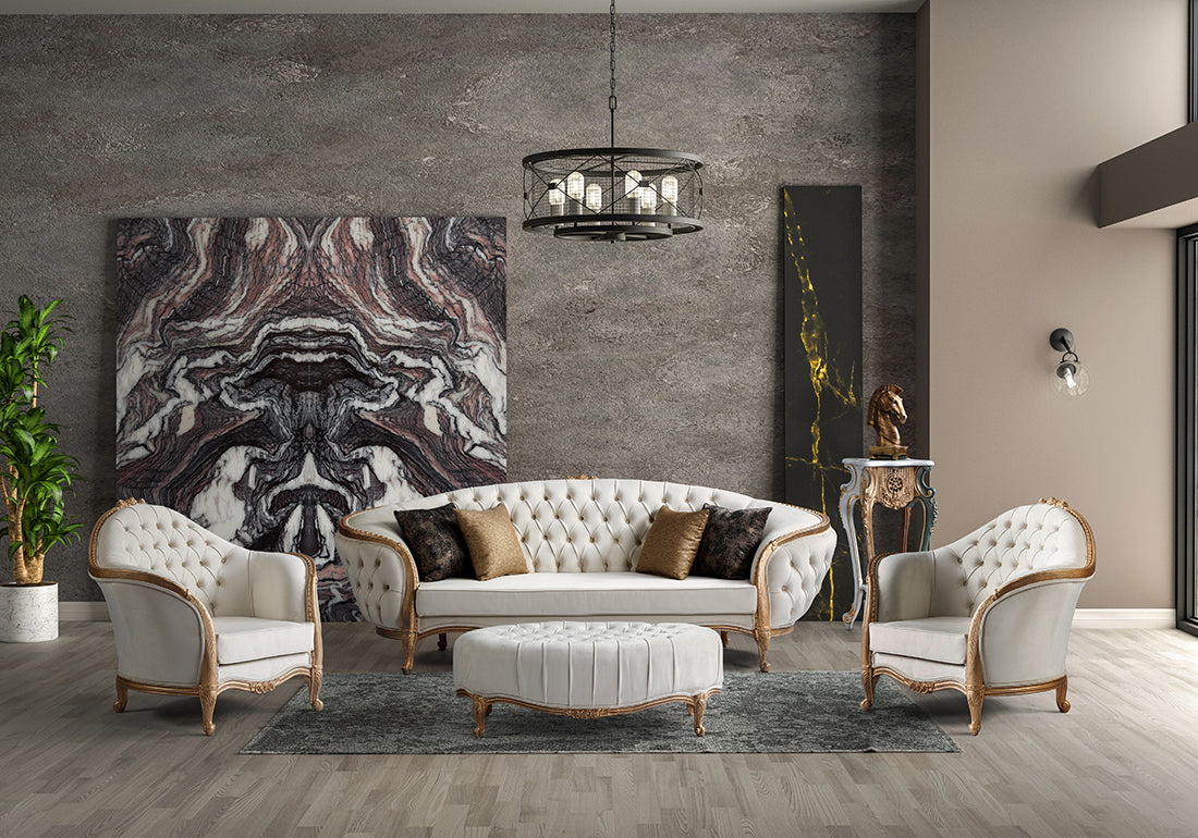 The sofa set is upholstered with high-quality, plush cushioning to provide maximum comfort for you and your guests. The generously padded seats and backrests are designed to offer optimal support, ensuring relaxation during long conversations or quiet moments at home. The fabric or leather upholstery (customizable) is both soft to the touch and highly durable, ensuring it withstands daily use while retaining its luxurious appearance.