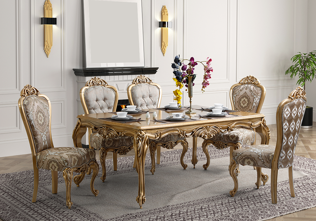 Royal Design Aesthetic: This dining set features classic, stately design elements that evoke elegance and sophistication. The chairs offer plush comfort with luxurious upholstery, while the table’s bold silhouette adds a sense of grandeur to your dining room.