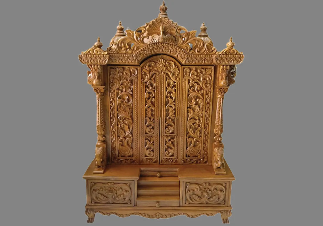 The Solid Teak Wooden Hand Carved Home Temple is a magnificent and spiritually significant piece of furniture that adds a touch of elegance and devotion to your living space. Crafted from premium teak wood, celebrated for its durability and rich natural beauty, this home temple embodies a sense of warmth and reverence.
